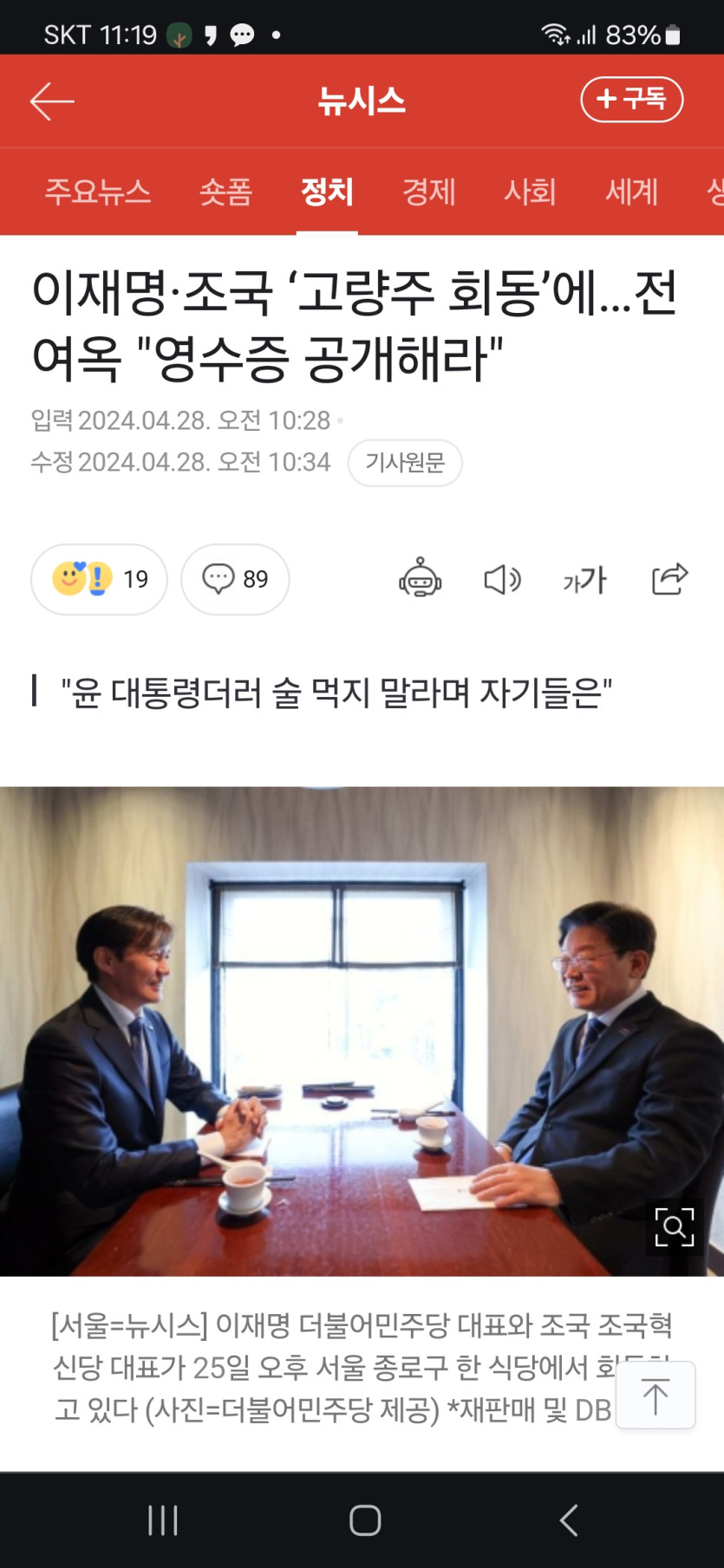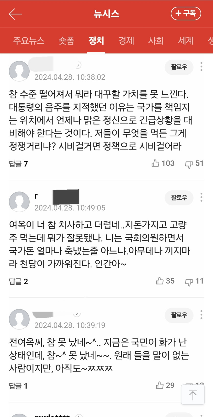 이재명과 조국의 고량주 회동에 영수증 공개해라는 전여옥 페이지 정보 작성자 윤씨네쪽지보내기 메일보내기 자기소개 아이디로 검색 전체게시물쪽지보내기 메일보내기 자기소개 아이디로 검색 전체게시물 작성일 2024.04.28 11:25 4,036 조회 0 추천 0 비추천 목록 본문 무엇이 무서워서 이들이 만나는 것을 경계하는 것이냐? 아직도 총선에서 참패한 이유를 모르는 것이냐? 0 추천 0 비추천 SNS 공유 신고 차단 태그 #조국, #이재명 댓글 0 로그인한 회원만 댓글 등록이 가능합니다. 이전글 다음글 목록